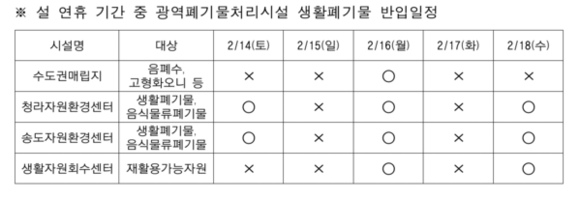 송도 자원 환경 센터와 청라 자원 환경 센터는 오는 15일과 설 당일인 17일을 제외한 연휴 기간 동안 반입을 허용하며 수도권 매립지는 16일 하루에 한해 반입이 가능하다. 다만, 수도권 매립지 반입은 공휴일 반입을 허용하는 것으로 직매립 금지 원칙은 현행대로 유지된다.