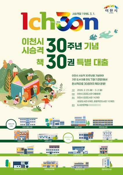 이천시는 시 승격 30주년(시승격일 1996.3.1.)을 기념해 시민의 독서 참여를 확대하고 책 읽는 도시 이천의 정체성을 강화하고자, 오는 23일부터 3월 2일까지 ‘책 30권 특별대출’ 서비스를 운영한다.
