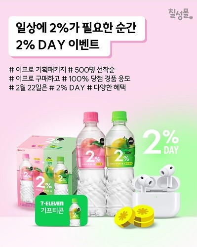 경품은 에어팟, 2% 부족할 때 파우치와 키링, 2% 부족할 때 바이탈 레몬라임 1박스, 칠성몰 포인트 등이며 추첨을 통해 전원에게 지급된다.