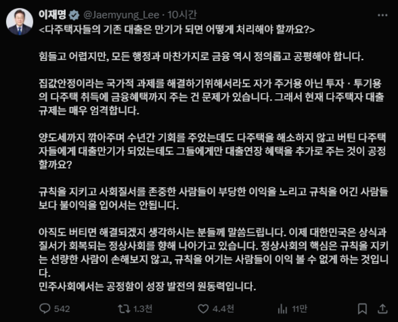 이어 “금융 역시 정의롭고 공평해야 합니다”라며 “집값 안정이라는 국가적 과제를 해결하기 위해서라도 자가 주거용 아닌 투자-투기용의 다주택 취득에 금융 혜택까지 주는 건 문제가 있습니다. 그래서 현재 다주택자 대출 규제는 매우 엄격합니다”라며 “양도세까지 깎아주며 수년간 기회를 주었는데도 다주택을 해소하지 않고 버틴 다주택자들에게 대출 만기가 되었는데도 그들에게만 대출 연장 혜택을 추가로 주는 것이 공정할까요?”라고 이어갔다.
