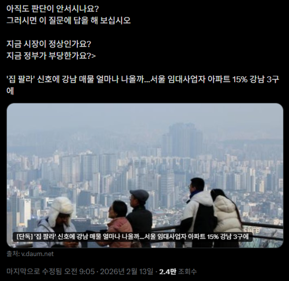 정당성이 다주택자에게 있다면 그들이 이기겠지만, 정당성이 정부 정책에 있다면 국민과 금융권이 결국 승부의 균형추를 정부 쪽으로 밀어줄 것이라는 신뢰를 이 대통령이 다시 한 번 드러내는 질문이었다.