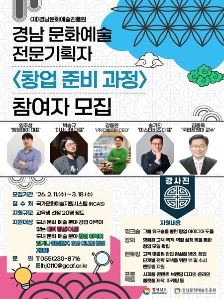 경남문화예술진흥원은 '2026 경남 문화예술 전문기획자 양성사업'의 일환으로, '창업 준비 과정' 참여자를 모집한다고 13일 밝혔다.