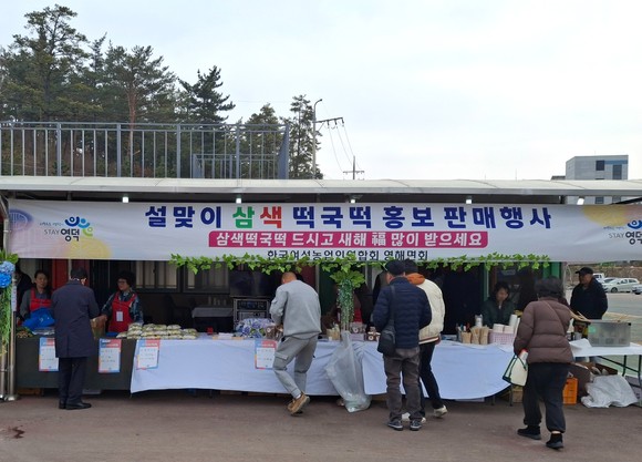한국여성농업인연합회 영해면회는 설 연휴를 앞둔 지난 14일 영해휴게소에서 지역을 찾은 귀성객과 관광객들에게 삼색 떡국떡과 지역 농산물을 알리고 판매하는 행사를 펼쳤다.
