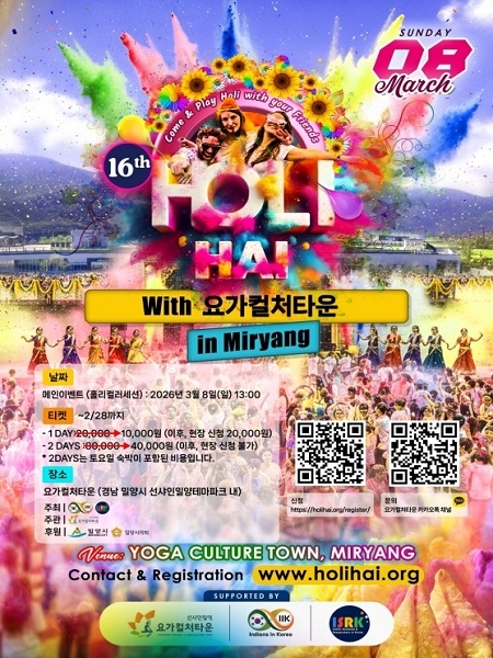 주한인도인공동체협회(IIK)가 주최하는 '홀리해이 페스티벌'은 2011년부터 이어져 온 축제로, 올해 제16회 축제는 밀양 요가컬처타운의 주관으로 진행된다.