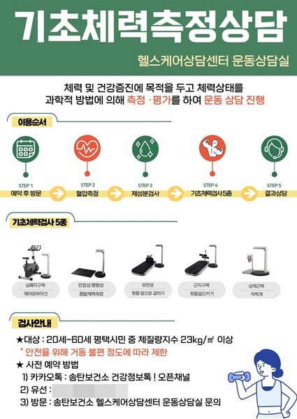 두 가지 측정 프로그램 모두 송탄보건소 1층 헬스케어상담센터에서 진행되며, 예약은 카카오톡 채널 ‘송탄보건소 건강정보톡!’ 또는 전화로 가능하다.