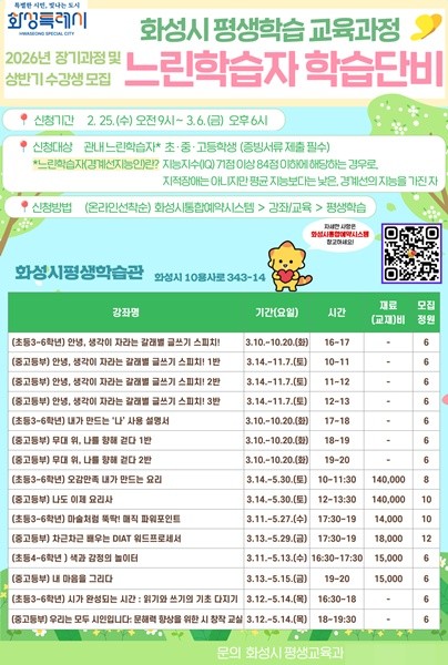 화성특례시는 오는 3월 6일까지 ‘느린학습자 학습단비’ 장기 과정 및 상반기 수강생을 모집한다고 밝혔다.