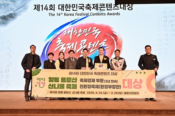 양평군은 지난 24일, 용산기념관 내 피스앤파크컨벤션에서 개최된 ‘2026년 제14회 대한민국 축제 콘텐츠 대상’ 시상식에서 축제 경제 부문 3년 연속 대상 수상의 영예를 안았다. 또한, 국내 최초로 친환경 축제 분야에서 환경부장관상을 수상하며 지속 가능한 축제 운영 성과를 인정받았다.