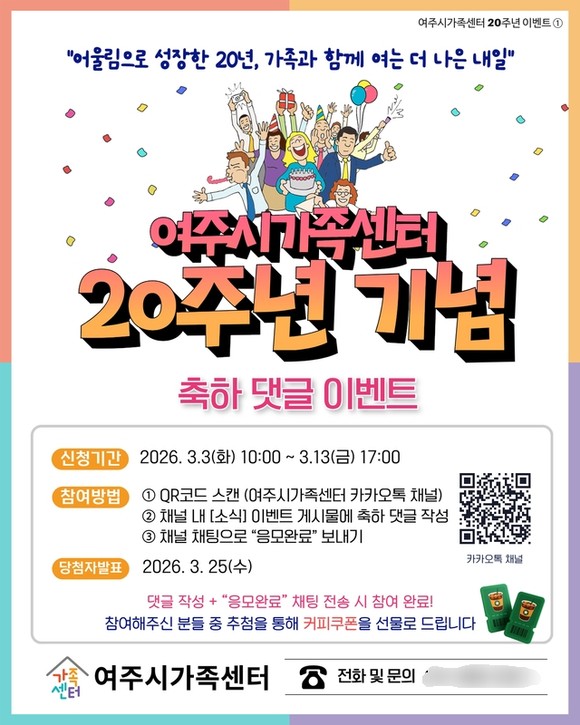 이번 ‘20주년 축하 댓글 이벤트’ 참여 방법 및 자세한 사항은 여주시가족센터 카카오톡 채널을 통해 확인할 수 있으며, 전화로도 문의 가능하다.