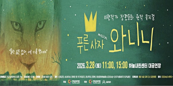누적 판매 100만부를 기록한 이현 작가의 베스트셀러 동화책을 원작으로 한 창작 뮤지컬 푸른사자 와니니는 한국문화예술위원회 주관 '2025년 공연예술 창작 산실 올해의 신작'에 선정돼 오는 28일 오전 11시와 오후 3시, 인제 하늘내린센터 대공연장에서 첫 무대를 올린다.