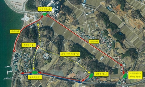 전면통제 구간은 선진공원 내 도로(선진마을 입구, 체리블라썸, 조명군총)이고, 일방통행 구간은 선진마을 주차장 → 스카이나마리나 회전교차로이다.