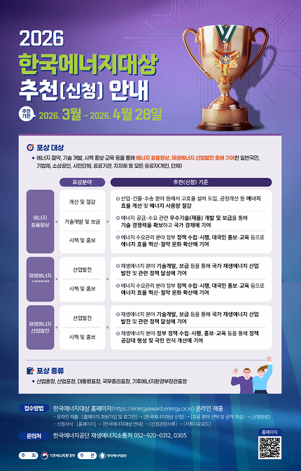 한국에너지공단은 지난 17일부터 내달 28일까지 ‘2026년 한국에너지대상’ 유공자 포상에 대한 추천(신청)을 받는다고 18일 밝혔다.