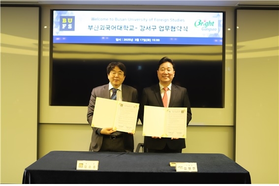 강서구는 지난 17일 부산외국어대학교 총장실에서 지역사회 교육 활성화와 관·학 협력 강화를 위한 업무협약(MOU)을 체결했다고 밝혔다. 이번 협약은 지역 주민과 학생, 기업을 대상으로 다양한 교육 프로그램을 운영하고, 대학과 지자체 간 협력체계를 구축하기 위해 마련됐다.
