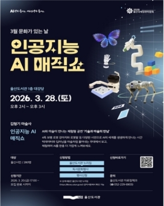 울산도서관은 오는 3월 28일 오후 2시 도서관 1층 대강당에서 3월 문화가 있는 날 행사로 ‘인공지능(AI) 마술(매직)쇼’ 공연을 개최한다고 19일 밝혔다.