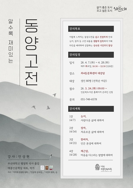 해운대구는 오는 4월과 5월 두 달간 좌4동 문화센터에서 주민 대상 인문학 프로그램 ‘고전의 창(窓)’을 운영한다고 밝혔다. 이번 프로그램은 해운대인문학도서관 방문이 어려운 우·중·좌동 주민들의 문화 수요를 반영해 기획된 것으로, 도서관 콘텐츠를 생활권 가까이에서 접할 수 있도록 한 것이 특징이다.