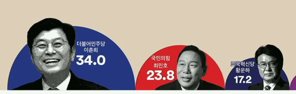 [세종시] 민주 이춘희 34%, 국힘 최민호 23.8%, 조국 황운하 17.2%