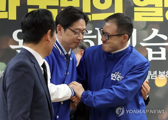 더불어민주당 김경수 경남도지사 후보(가운데)가 23일 경남 김해시 진영읍 강금원기념봉하연수원 강연장에서 열린 현장 최고위원회의에 앞서 김상욱 울산시장 후보(오른쪽)와 인사를 나누고 있다. (사진=연합뉴스)