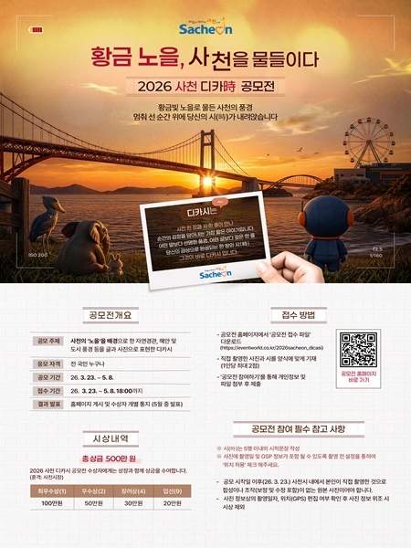 시 관계자는 “이번 공모전은 사천을 대표하는 '황금 노을'의 가치를 재조명하고, 전국의 감성을 사천으로 끌어들이는 계기가 될 것”이라며 “많은 국민들이 디카시를 통해 사천의 아름다움과 매력을 창의적으로 표현해 주길 기대한다”고 말했다.