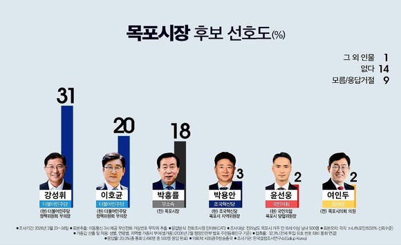 같은 시기 실시된 또 다른 조사에서도 강 예비후보의 상승세는 이어졌다. 지역 매체 목포뉴스가 모노리서치에 의뢰해 실시한 조사에서 강 예비후보는 38.0%를 기록해 이 예비후보(30.6%)를 7.4%포인트 차로 앞서며 선두를 유지했다.