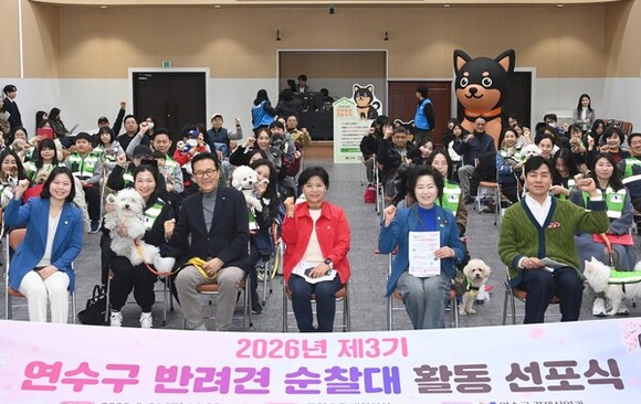 연수구는 구청 대회의실에서 반려견 순찰대 '연수지킴댕댕이' 활동 선포식을 열고 3기 순찰대원을 공식 위촉했다.