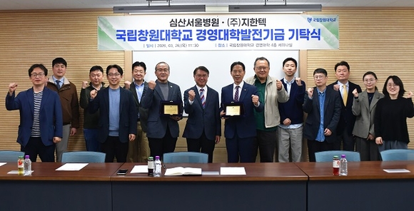 26일 심산서울병원·지한텍 국립창원대학교 경영대학 발전기금 기탁식 기념촬영 모습.(사진=국립창원대 제공)
