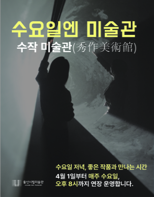 울산시립미술관은 시민들의 문화 향유 기회를 넓히기 위해 오는 4월부터 매주 수요일 운영 시간을 연장하는 ‘수작미술관(秀作美術館)’을 운영한다고 27일 밝혔다.