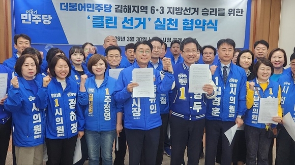 오는 6·3 지방선거에 출마하는 더불어민주당 김해지역 예비후보들이 30일 오전 김해시청 프레스센터에서 협약식을 하고 시민 앞에 부끄럽지 않은 '클린 경선'을 치르겠다고 약속했다.