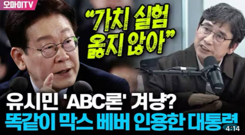합당한 해석일까요? 아닙니다. 이 대통령의 발언을 유시민 ABC론에 대한 보충설명, 진일보(進一步: 한 발 더 나감)라고 볼 수는 있지만 유 작가 발언에 대한 전면적 비판으로 읽기는 힘들다는 게 제 생각입니다.