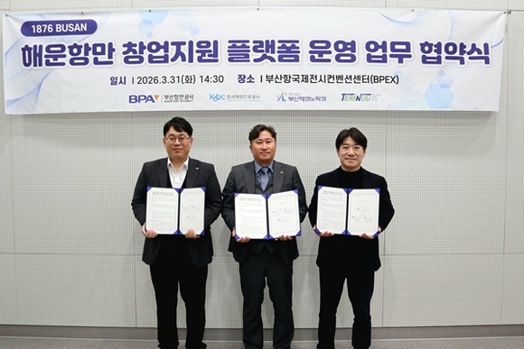 한국해양진흥공사(해진공), 부산항만공사(BPA), 부산테크노파크(부산TP)는 31일 부산항 국제컨벤션센터에서 해운항만 기술창업 지원 플랫폼 '1876 BUSAN'의 위탁 협약식 및 사업설명회를 가졌다.