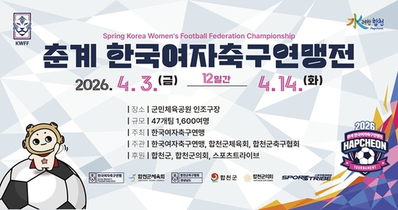 경남 합천군은 대한민국 여자축구의 미래를 이끌 선수들이 한자리에 모이는 '2026년 춘계 한국여자축구연맹전'이 오는 3일부터 14일까지 군민체육공원 인조구장에서 개최된다고 밝혔다.