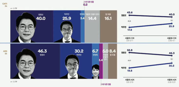 선두 정원오과 2위 박주민의 민주당 내 지지 격차는 여론조사꽃의 3월 2주차(3월 9~10일) 조사 결과와 비교하면 좁혀진 것으로 나타났다.
