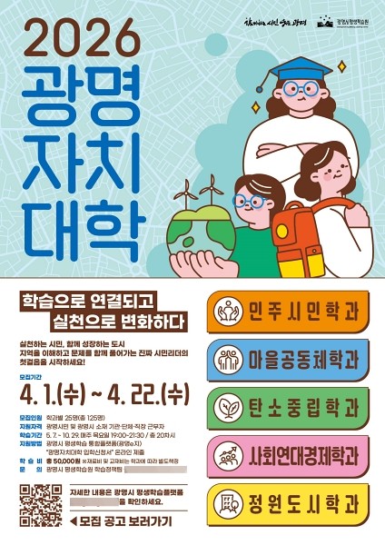 광명시가 시의 핵심의제인 평생학습 마을리더 양성과정 ‘광명자치대학’ 2026년 신입생 125명을 오는 22일까지 모집한다.
