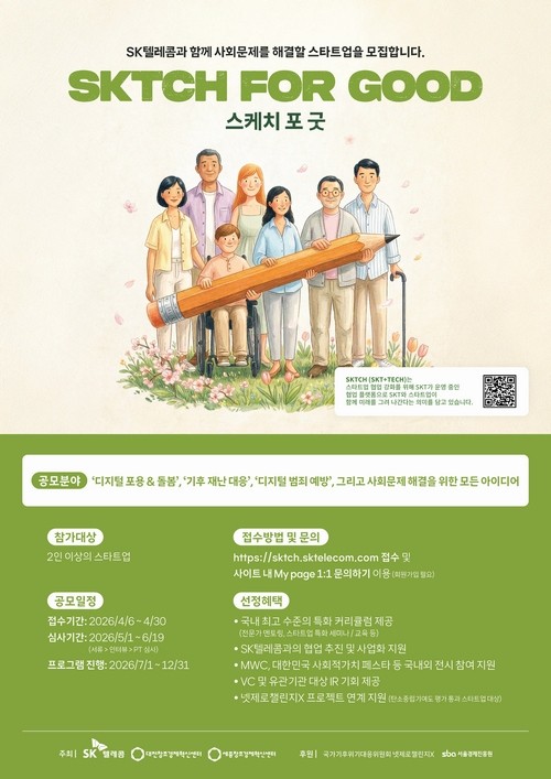SKT는 ‘SKTCH for Good’을 통해 ESG 분야 스타트업과 함께 사회·환경 문제 해결에 나선다. 디지털 포용·돌봄, 기후 재난 대응, 디지털 범죄 예방 등 향후 중요성이 커질 것으로 예상되는 영역을 중심으로, 혁신적인 ESG 설루션을 보유한 스타트업 15개사를 선발할 계획이다.