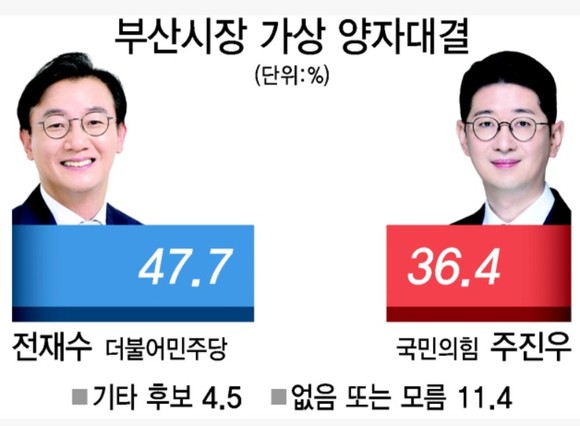 그리고 같은 조사에서 주 의원과 가상 양자 대결에서는 ‘전재수’ 47.7% vs ‘주진우’ 36.4%로 11.3%p의 격차로 박 시장보다 전 의원과의 지지율 격차를 좁힌 것으로 나타났다.