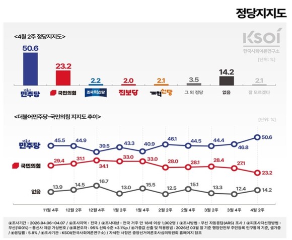 여론조사 전문기관 한국사회여론연구소(KSOI)가 지난 6~7일 이틀 동안 전국 18세 이상 성인 남녀 유권자 1002명을 대상으로 실시한 4월 2주차 정례 조사에서 ‘이번 지방선거에서 어느 당을 지지하겠는가?’라는 질문에 ‘민주당’이라는 답변이 전주 대비 3.8%p 상승한 과반이 넘는 50.6%, 반면, 국민의힘은 3.9%p 하락한 23.2%로 민주당의 절반에도 못미쳤으며, 이어 조국혁신당 2.2%, 개혁신당 2.1%, 진보당 2.0%, ‘기타 정당’ 3.5%, ‘무당층’(없음. 잘모름) 16.3%로 각각 집계됐다.