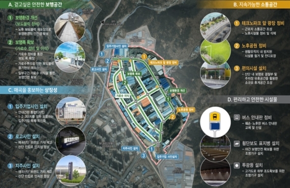 주요 사업 내용은 ▲노후도로 정비 ▲보행 친화형 보도 정비 ▲가로수 정비 ▲안내판 정비 ▲근로자 편의시설 조성 등으로 기반시설 정비뿐 아니라 경관·안전·휴식 기능을 고루 갖춘 산업단지로 탈바꿈시키겠다는 계획이다.