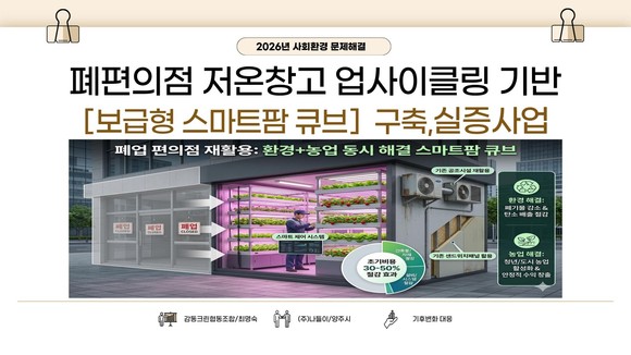 시에 따르면, 감동크린협동조합의 ‘폐편의점 저온창고 업사이클링 기반 보급형 스마트팜 큐브 구축·실증사업’이 ‘2026년 사회환경 문제해결 지원사업’ 대상으로 최종 선정됐다. 이 사업은 폐기되는 냉장·공조설비를 재활용해 스마트팜 인프라로 전환하는 방식으로, 사업 소요비 일정 부분을 지원받는다.
