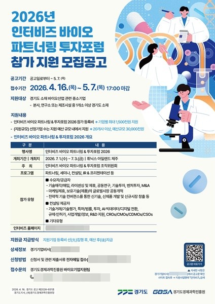 경기도는 (재)경기도경제과학진흥원과 함께 도내 바이오·제약 기업의 기술사업화와 투자 활성화를 지원하기 위해 ‘인터비즈 바이오 파트너링&투자포럼 2026’에 참가할 기업을 모집한다.