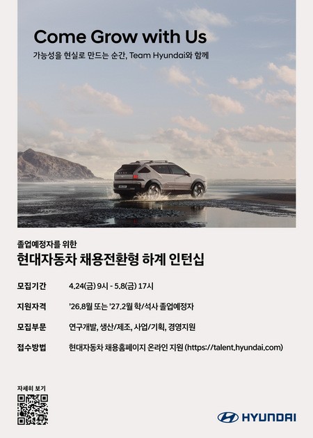 현대차는 “모빌리티 혁신을 이끌어갈 우수 인재를 조기에 발굴하고, 재학생에게 실무경험 기회를 폭넓게 제공하기 위해 채용전환형 인턴십을 기획했다”며 “지원 절차를 대폭 간소화한만큼 창의적이고 열정적인 인재들의 적극적인 지원을 기대한다”고 밝혔다.