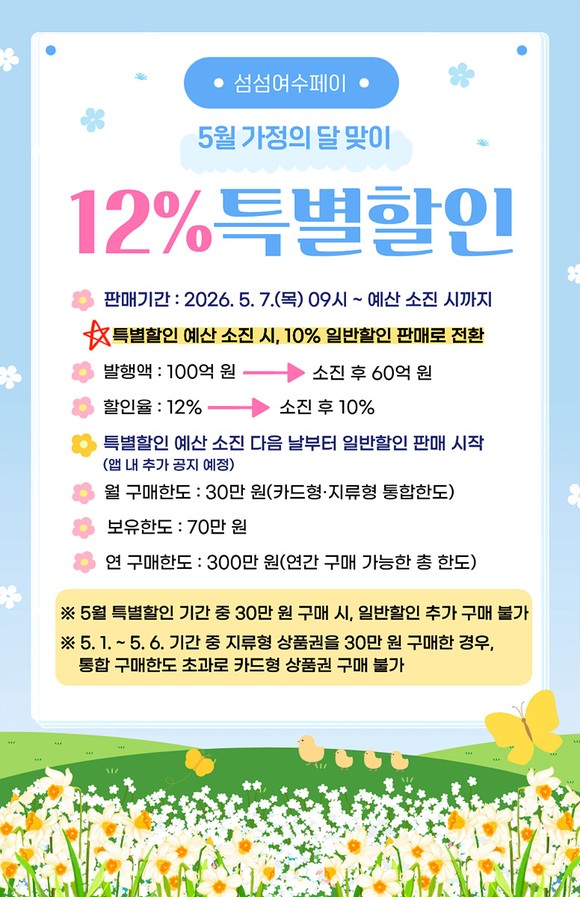 특히 100억 원 규모의 특별할인을 통해 12%의 할인 혜택을 제공하며, 해당 물량이 소진될 경우 다음날부터는 10% 할인율로 60억 원을 추가 발행해 소비 진작 분위기를 이어갈 방침이다. 특별할인은 5월 7일 오전 9시부터 예산 소진 시까지 진행된다.