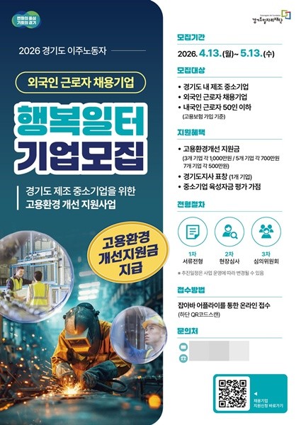 경기도와 경기도일자리재단은 도내 외국인 근로자를 고용한 중소 제조기업을 대상으로 ‘2026년 경기도 이주노동자 행복일터 선정사업’ 참여기업을 모집한다고 20일 밝혔다.