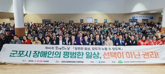 군포시는 지난 20일, 군포시장애인센터 다목적실에서 ‘제46회 장애인의 날 기념식’을 열고, 장애인과 비장애인이 함께 어우러지는 화합의 장을 마련했다.