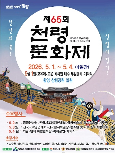올해 천령문화제는 전통과 현대가 어우러진 공연과 체험 프로그램을 중심으로, 군민과 관광객이 함께 만들고 즐기는 참여형 축제로 꾸며진다.