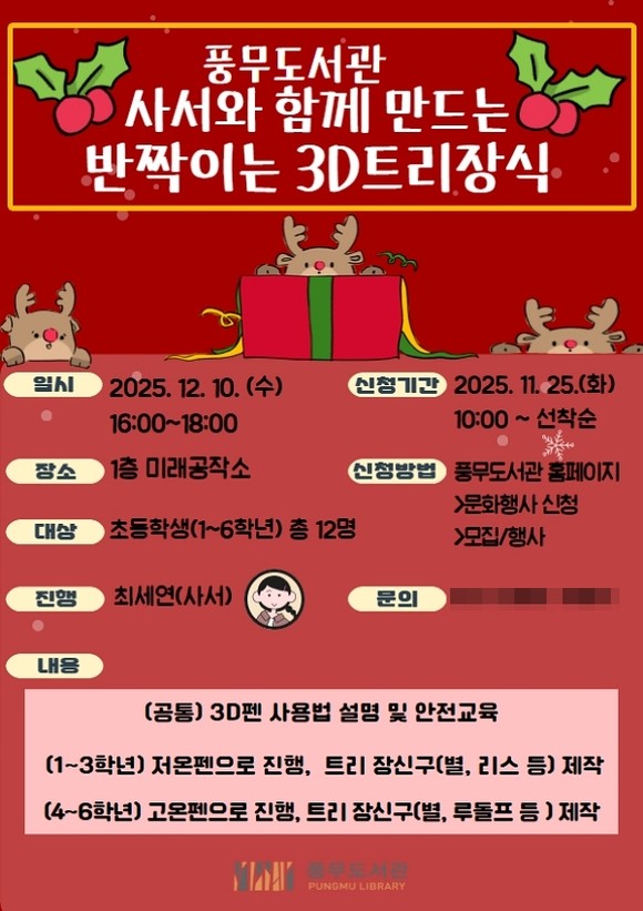 연말 시즌에 맞춘 활동으로 크리스마스 분위기를 자연스럽게 느낄 수 있는 점도 특징이다. 프로그램은 풍무도서관 특화담당 사서가 직접 진행해 안전하고 체계적으로 지도할 예정이다.