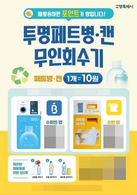 병 1개당 10점의 포인트가 쌓이고, 일정 포인트 이상 적립할 경우 포인트만큼 실제로 보상을 획득할 수 있다. 기기 종류는 두 갈래로, 고양시에서는 ‘수퍼빈’과 ‘리턴’ 계열 앱을 각각 구분해 안내하고 있다. 일부 기기는 투명페트병과 캔을 함께 받고, 일부는 투명페트병만 받는다.