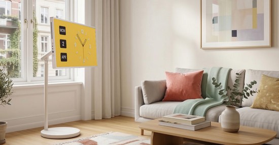 전용 액세서리인 원클릭 스탠드를 활용해 가로/세로 등 보고 싶은 방향으로 세우고, 스트랩 액세서리로 편리하게 휴대하거나 벽에 걸어 액자 또는 시계로도 연출 가능하다.