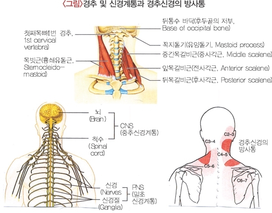 뇌에서 뻗어 내려온 신경은 목의 경추를 통해 양팔을 거쳐 손까지 퍼져 나감으로써, 목에 문제가 있을 때 통증은 팔로 뻗어 나가며, 반대로 손에 이상이 있는 경우 목에서도 증세를 느낄 수가 있다.