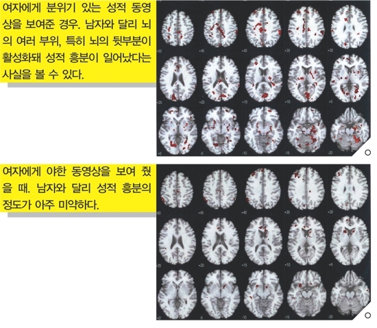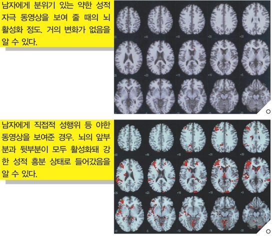 반면 남성은 노출이 심하면서 노골적 성행위를 보여주는 두 번째 영상에 대해 대뇌가 보다 활발히 반응했다. 또 여성과 달리 전두엽과 후두엽이 활발했다. 일명 '뒤통수엽'으로 불리는 후두엽은 대뇌의 가장 뒷부분에 위치하고 있으며, 눈으로 들어온 시각 정보를 분석해 눈으로 본 물체의 모양이나 위치, 운동 상태를 분석하는 기능을 한다.
