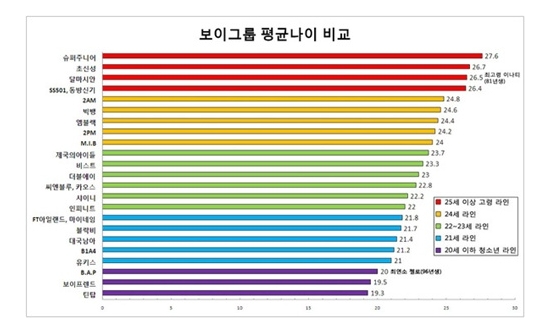 공개된 남자 아이돌 평균 나이 그래프에는 남자 아이돌 그룹의 평균 나이가 많은 순으로 정리돼있다. 남자 아이돌 평균 나이 그래프를 살펴보면 최고령 남자 아이돌 그룹은 평균 나이 27.6세를 보이고 있는 슈퍼주니어다.