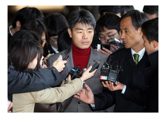 ▲국무총리실의 민간인 불법사찰과 관련해 증거인멸 의혹을 폭로한 장진수 전 공직윤리지원관실 주무관(가운데)이 지난 20일 오전 서울 서초동 서울중앙지검에 참고인 자격으로 소환돼 기자들의 질문을 받고 있다.(사진=연합뉴스)