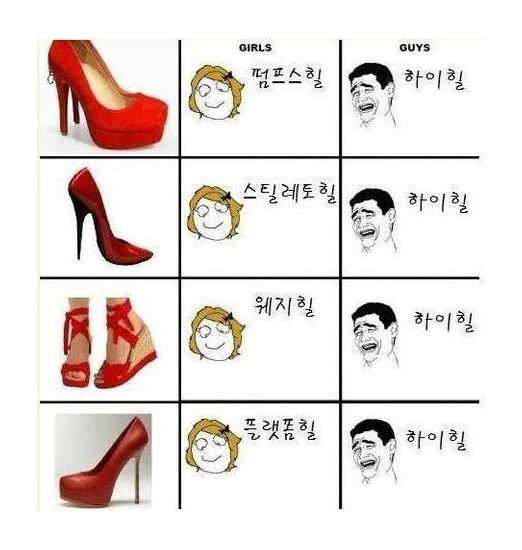 여자는 웨지힐, 펌프스힐, 스틸레토힐 등 하이힐의 종류를 다 알고 있지만 남자는 전부다 ‘하이힐’이라로 생각하고 있는 모습이다.